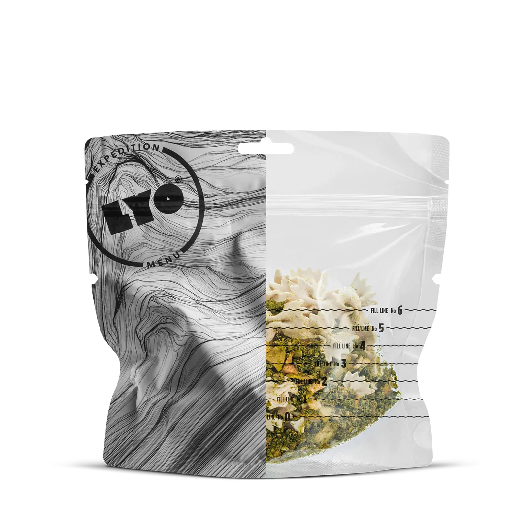 Farfalle, farfalloni, farfalline… it all means butterflies, smaller or larger! This beloved type of pasta is appreciated for its delicate surface and cheerful shape, which combines a thick center with thinner wings. It is said that the variety of textures makes farfalle especially well-suited for cream sauces, and we couldn’t agree more. We imagined them in a rather classic Italian entourage accompanied by spinach and Gorgonzola cheese, and garnished with almond flakes. Seems like we did it right as LYO Farfalle has been capturing the palates of adventure-hungry outdoor enthusiasts from day one, giving them butterflies wherever they go.